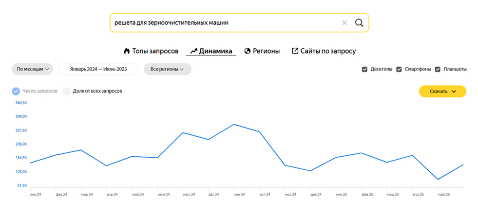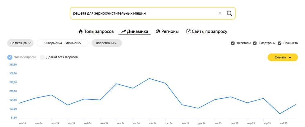 - Продвижение по ключевым словам с самыми популярными брендами без указания конкретной модели (решета для BUHLER и т. п.).