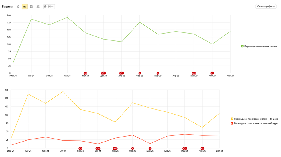 Трафик с поисковых систем в сравнении с динамикой спроса и учётом модернизации сайта (которая часто приводит к потребности в полной переиндексации и временному снижению позиций при смене структуры) показывает, что даже при общем снижении спроса сайт сохранял стабильный трафик с поиска.