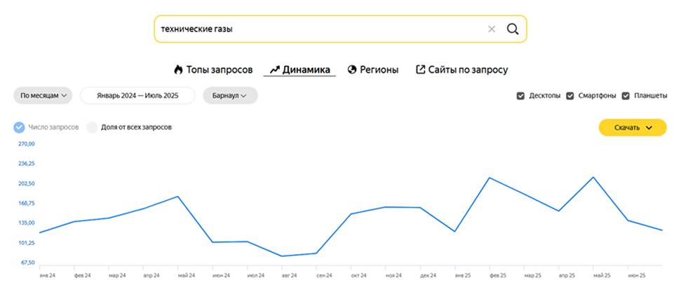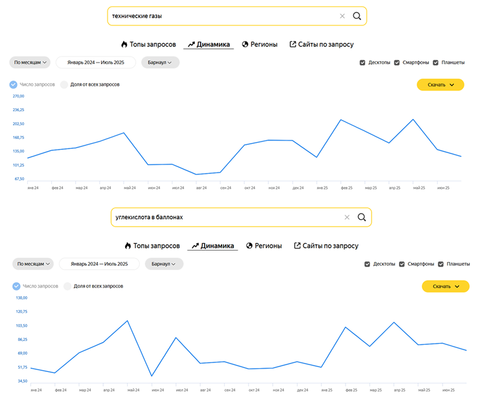Спрос имеет сезонные особенности – всплески и снижения как в общем по тематике, так и по конкретным видам газов.