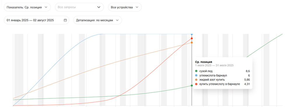 Примеры динамики средней позиции в поиске по запросам о конкретных газах.