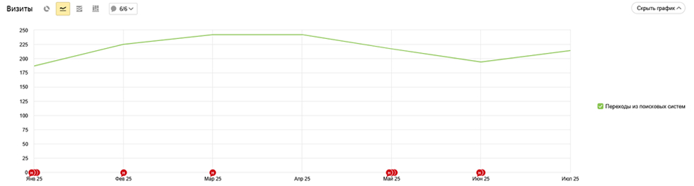 Трафик с поисковых систем в сравнении с динамикой спроса и учётом модернизации сайта (которая часто приводит к потребности в полной переиндексации и временному снижению позиций при смене структуры) показывает, что даже при общем снижении спроса сайт сохранял стабильный трафик с поиска.
