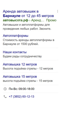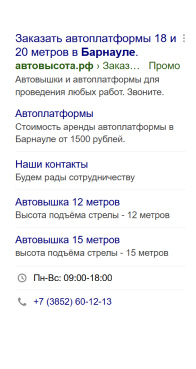 - Заголовки: “Аренда автовышки срочно” vs “Автовышка в Барнауле от 1500₽”