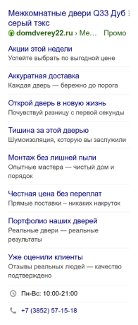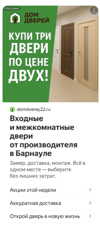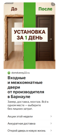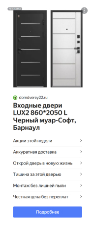 - Фид был структурирован по категориям (межкомнатные двери, входные двери, аксессуары), что позволило формировать максимально релевантные объявления для разных сегментов аудитории.