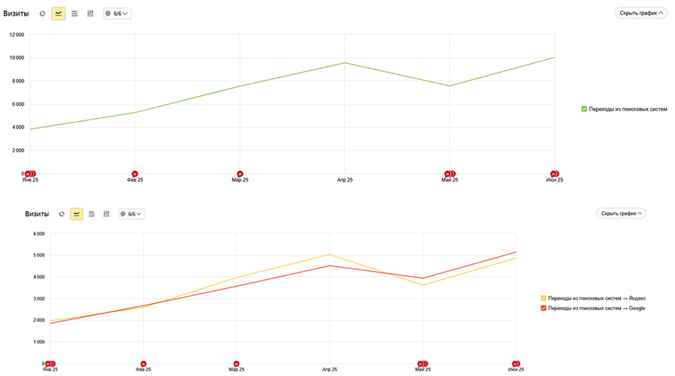 Трафик с поисковых систем в сравнении с динамикой спроса и учётом модернизации сайта (которая часто приводит к потребности в полной переиндексации и временному снижению позиций при смене структуры).
