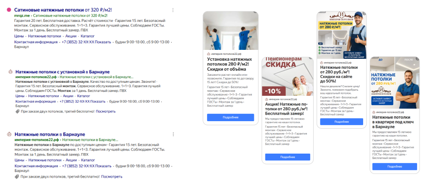 - Преимущества «Империи Потолков»: разработка современного сайта, внедрение квиза для повышения вовлеченности, подключение коллтрекинга и продуманная рекламная стратегия. Всё это позволило компании занять сильные позиции в digital‑среде, чего конкуренты в регионе не делали.