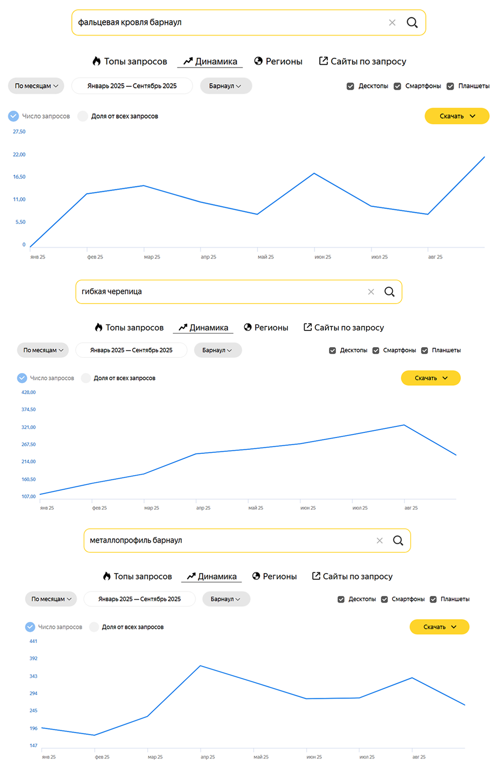 - Продвижение по категорийным запросам без товарных, потому что для тематики характерен поиск преимущественно видов строительных материалов, а не конкретных моделей