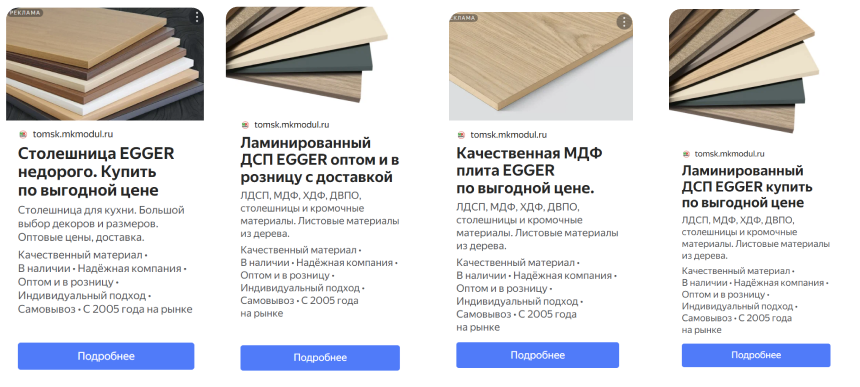 - Категорийная релевантность. Раздельные группы под «ЛДСП/МДФ», «Кромка», «Стеновые панели», «Столешницы» — совпадаем с потребностью.