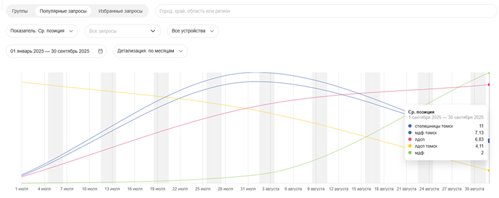 Динамика средней позиции в поиске по категорийным запросам: «лдсп», «мдф», «столешницы».
