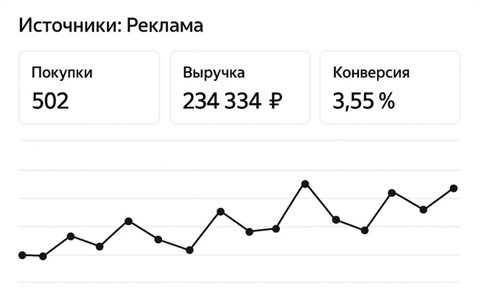 Кампания даёт коммерческий результат: получено 502 покупки из рекламных переходов на сумму 234 334 ₽. Средний чек ≈ 467 ₽ — нормальный уровень для текущего ассортимента и ценовой ниши.